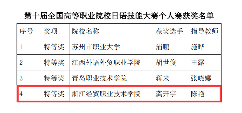 由龚开宇、纪雁俊、宋楚哲、陈振南、张含方5位同学组成的参赛团队在陈艳、袁可沁、费珏琼三位指导教师的指导下,从6月份开始利用课余时间,做了大量细致的准备工作,最终从全国近40支参赛队伍中脱颖而出,取得了团体三等奖的优异成绩,龚开宇同学荣获个人赛特等奖。这充分展现了应用日语专业的培养成效。我们将总结经验、再接再厉,为培养应用日语专业复合型人才做好准备,为学校的更好发展而不懈努力!