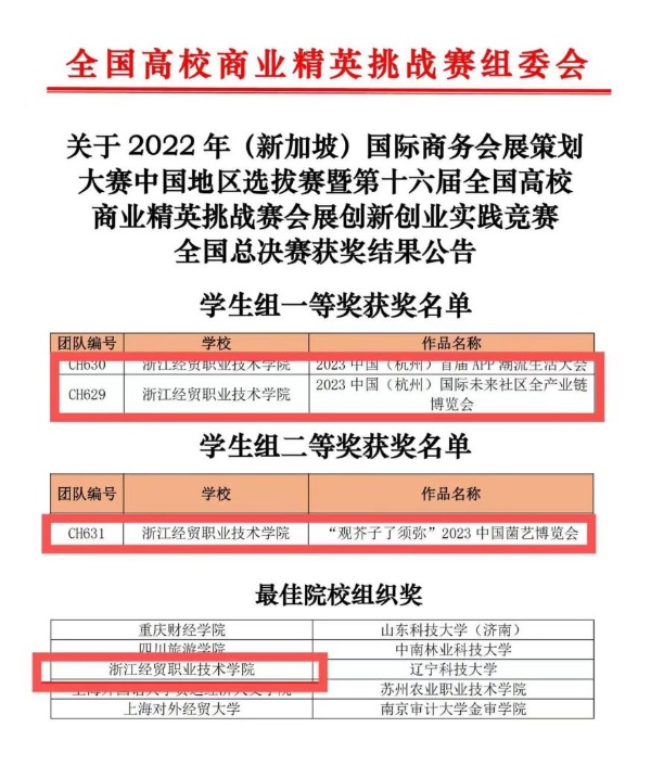 11月26日至28日,由中国国际贸易促进委员会商业行业委员会、中国国际商会商业行业商会、中国会展经济研究会和中国商业经济学会共同主办的“第十六届高校商业精英挑战赛会展创新创业实践竞赛全国总决赛”成功举办。学校会展策划与管理专业派出3支队伍参赛,在钱小轮、华尹、刘雅祺、何刚晴、胡芳芳、张俊磊等六位指导教师下,学校参赛队在2600支队伍中脱颖而出,荣获一等奖2项、二等奖1项,其中由华尹、钱小轮老师指导的项目“2023中国(杭州)国际未来社区全产业链博览会”策划方案夺得全国高职组亚军,方案入围2022年(新加坡)国际商务会展策划大赛,学校获评最佳组织院校奖。