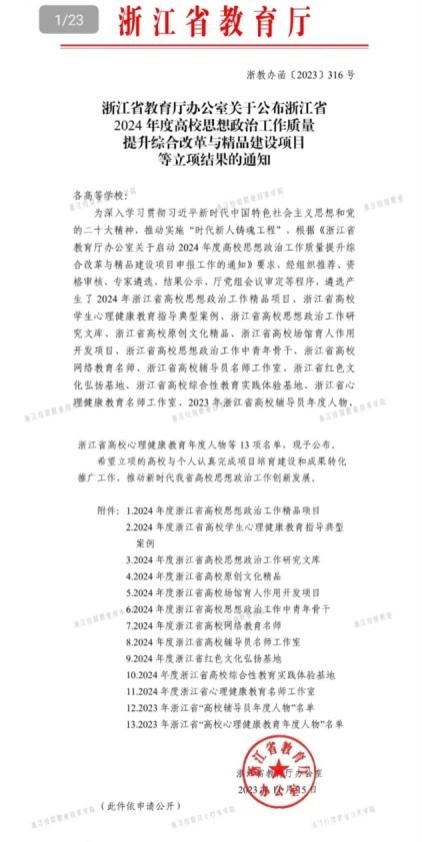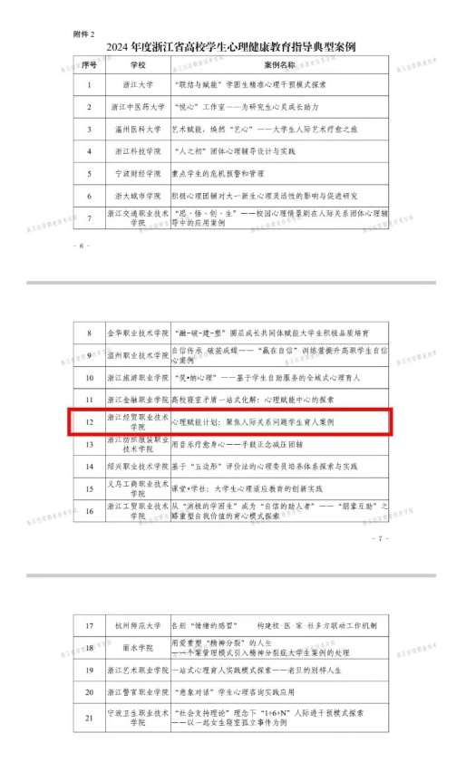 日前,我校国际贸易学院撰写《心理赋能计划:聚焦人际关系问题学生育人案例》入选浙江省2024年度心理健康教育指导典型案例,全省共有21个案例入选,其中高职院校12个,这是我校首次获得省级高校思想政治工作质量提升综合改革与精品建设项目。